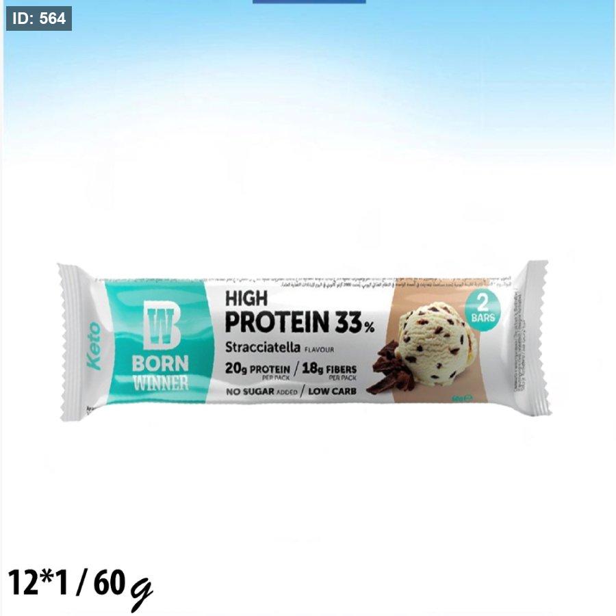 بار بروتين كيتو بنكهة السترacciatella من "Born Winner". تحتوي كل عبوة على لوحين.نسبة البروتين 33%.20 جرام بروتين و 18 جرام ألياف في كل عبوة.خالية من السكر المضاف.